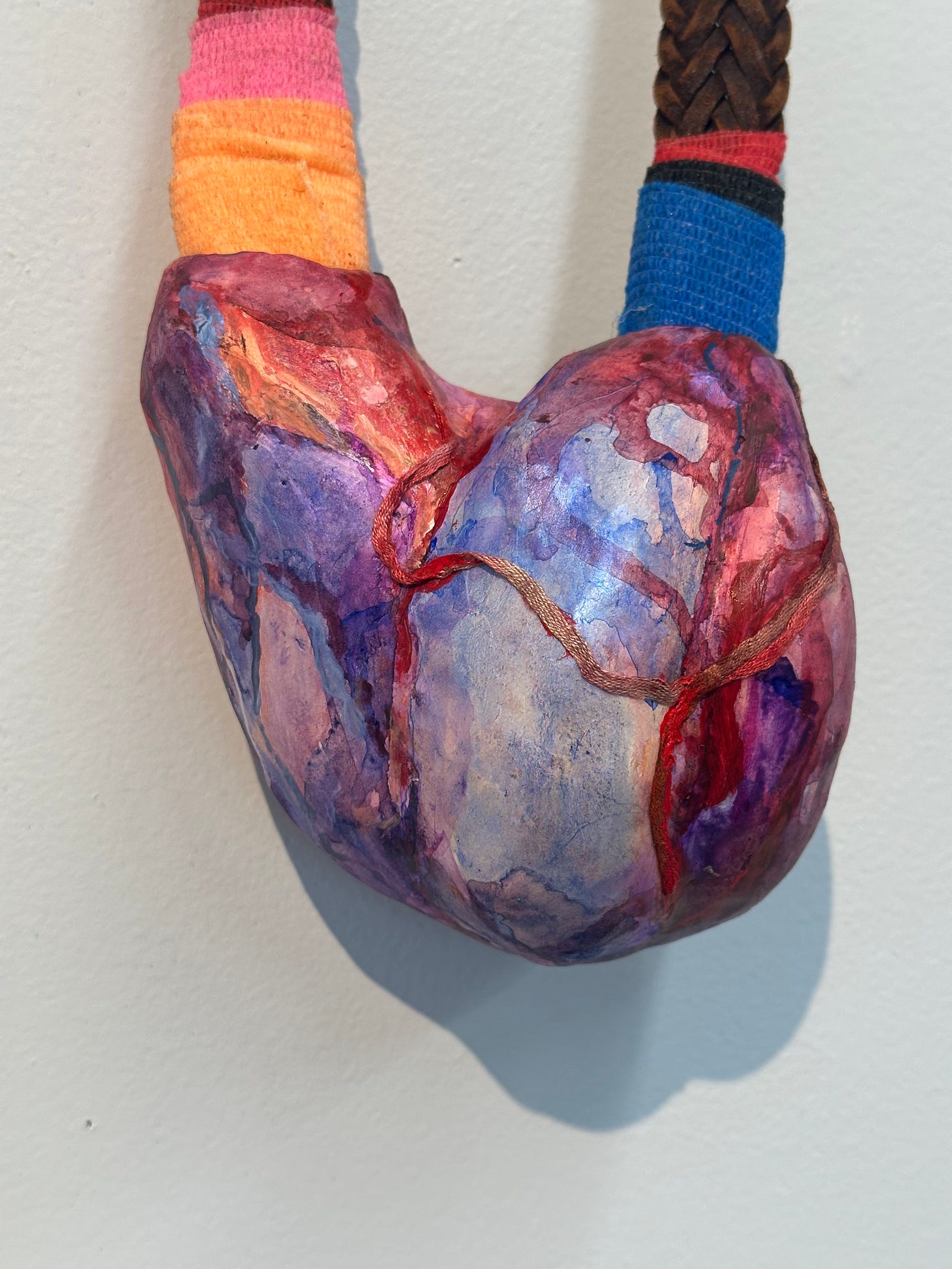 There’s nothing vaulting or poetic about these materials; their recognizable ordinariness hits home. The way she puts such objects together, though, shuttles them outside the mundane into a realm where humble, often forgotten things turn out to be the stuff of heartbreak and magic. Here, Laura writes about Heart on a String, a veined, translucent heart she made out of recycled pods from pieces of sculptures she made a dozen years ago. The heart she built hangs, like a beloved locket, on the gallery wall from a braided leather belt, swelling at top and bottom with rainbows of stretchy gauze bandages. The belt and bandages, previously worn on the body, feel intimate. Warm colors, woven textures. Connecting cords. Knobby, swollen, swaddled shapes that evoke our own unknown innards. The heart feels exposed.
